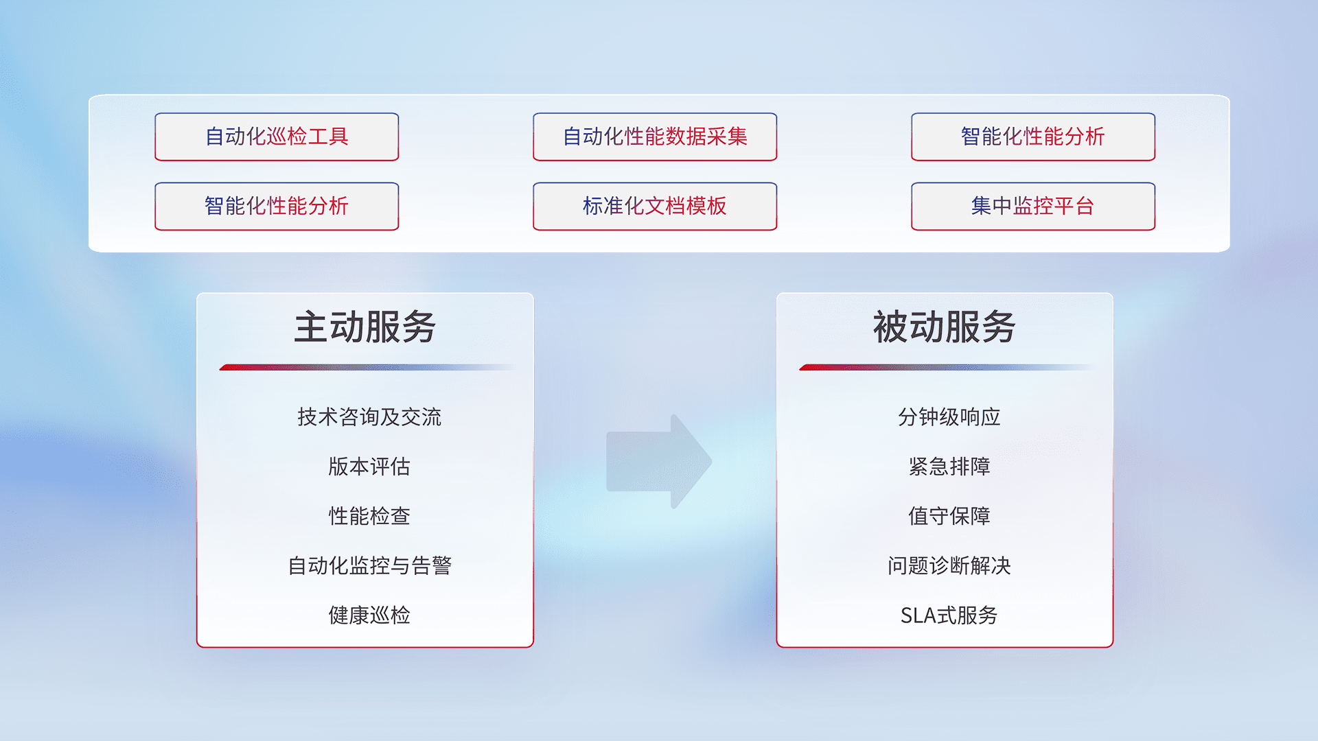 智能化工具和标准化文档,,保障服务质量,,,,提供主动服务(包含技术咨询、、、版本评估、、性能检查、、自动化监控与告警、、、、健康巡检)和被动服务包含(分钟级响应、、、紧急排障、、值守保障、、问题诊断解决、、、、SLA服务)。。。。