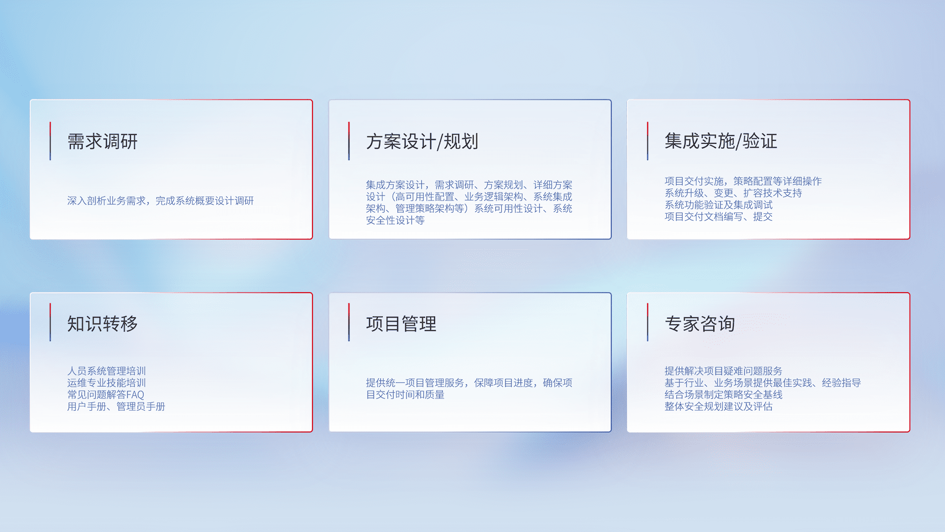 针对客户行业特性,,,将宏观的安全战略和需求,,通过专业的交付服务,,,实现项目落地,,,,为客户提供标准规范的集成交付服务。。。。
